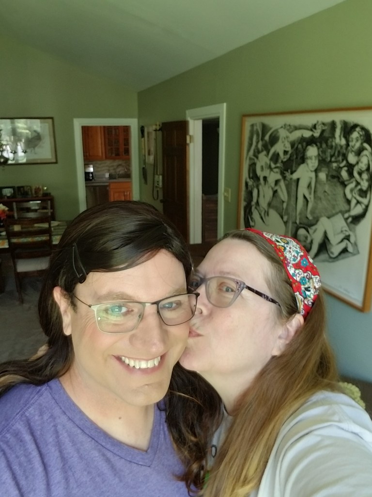 Now that Natalie has been transitioning for over a year – she came out in May 2020 and started hormone replacement therapy (HRT) in August 2020 – we’re both starting to feel more at ease. Each day the memory of my husband fades and the excitement of being married to a woman increases. There’s honey in sapphic love, and I love me some honey. Life seems gentler now that there is less testosterone in our home.